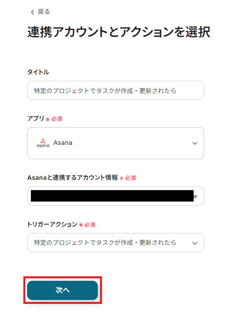 2.表示された画面で各項目を確認します。トリガーアクションはそのままにして、「次へ」をクリックしましょう。