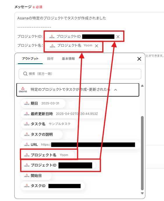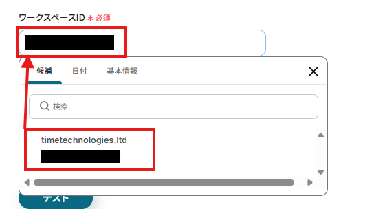 4.「ワークスペースID」「プロジェクトID」は、入力欄をクリックして表示される候補から選択してください。