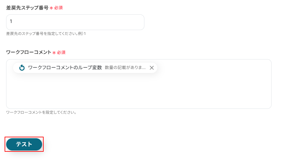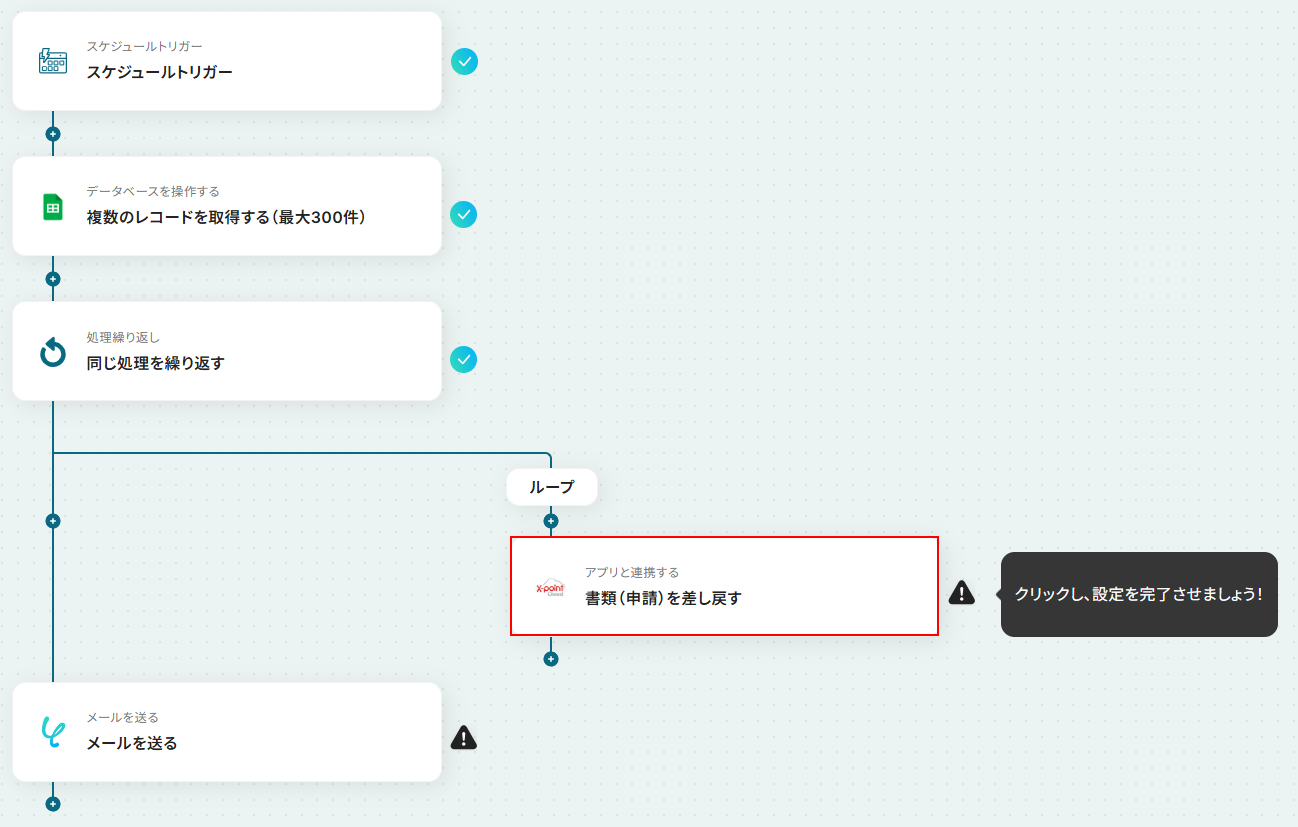 - 次に、オペレーションでX-point Cloudの「書類(申請)を差し戻す」アクションを設定し、ループ処理で取得した申請を一件ずつ差し戻します