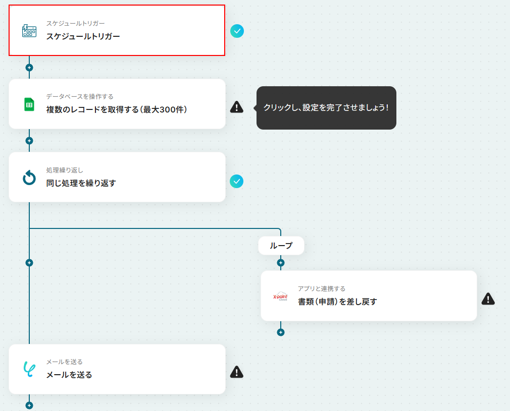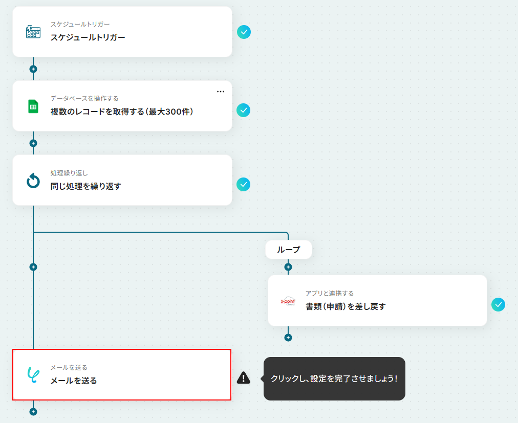 - スケジュールトリガーとGoogle スプレッドシート・同じ処理を繰り返す・X-point Cloud・メールを送るアクションの設定
