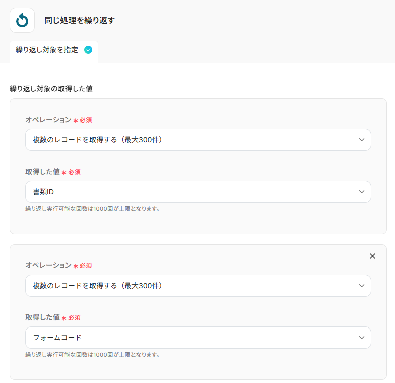 - 「同じ処理を繰り返す」オペレーションは、チームプラン・サクセスプランでのみご利用いただける機能となっております。フリープラン・ミニプランの場合は設定しているフローボットのオペレーションやデータコネクトはエラーとなりますので、ご注意ください。