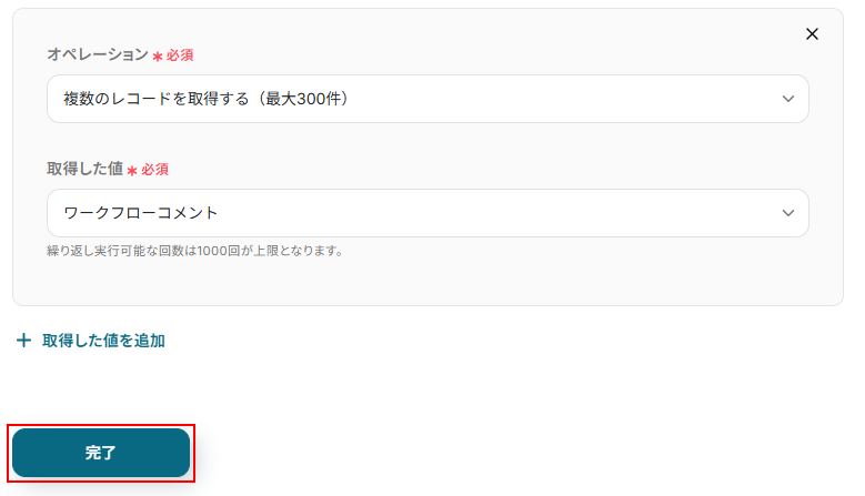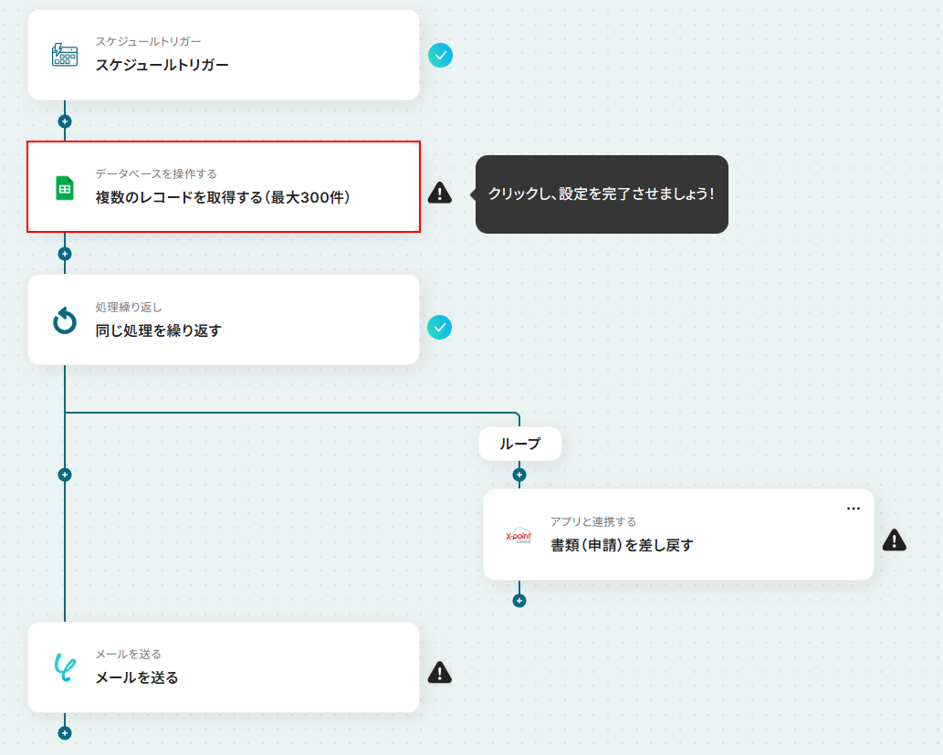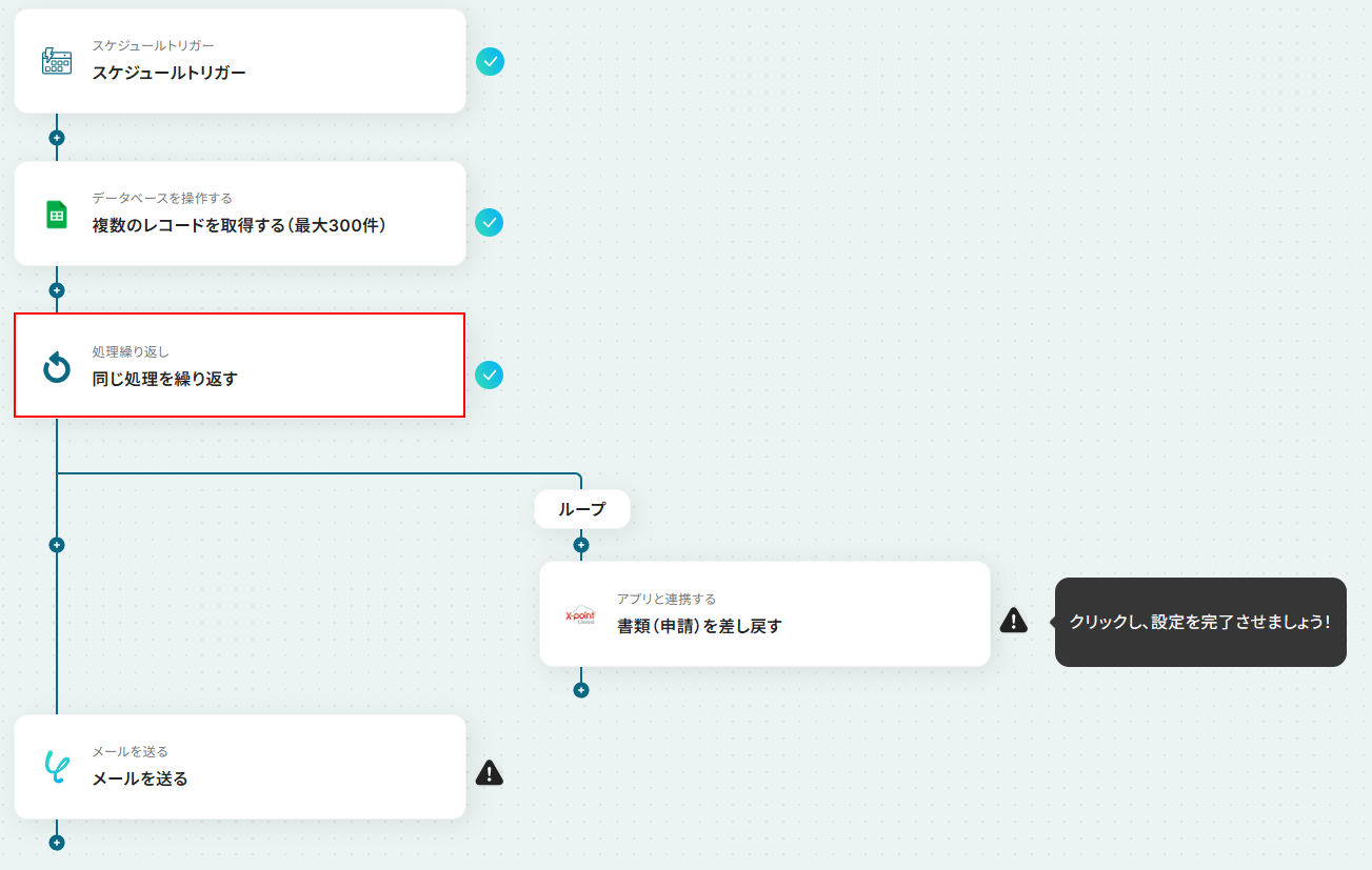 - 次に、「繰り返し機能」を設定し、取得したレコードごとに後続の処理を実行するようにします。