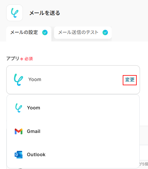 - 最後に、オペレーションでメール機能の「メールを送る」アクションを設定し、関係者に申請完了を通知します。