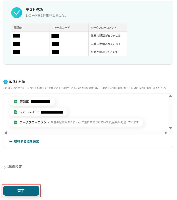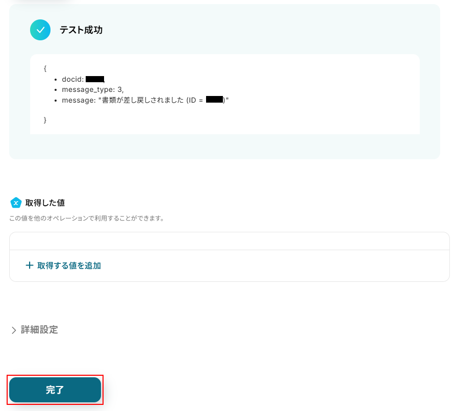 テストに成功するとテスト成功画面が表示され、取得した値が表示されます。