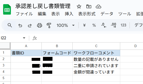 - X-point Cloudで書類を差し戻すアクションでは、Google スプレッドシートから取得した申請IDなどを引用し、差し戻し対象を動的に指定できます
