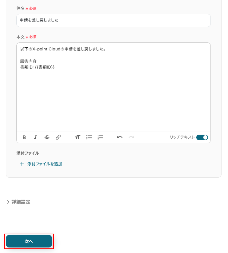 - メール機能では、差し戻し完了の通知先メールアドレスを自由に設定できるほか、本文に申請者名や書類IDといった動的な情報を差し込むことも可能です