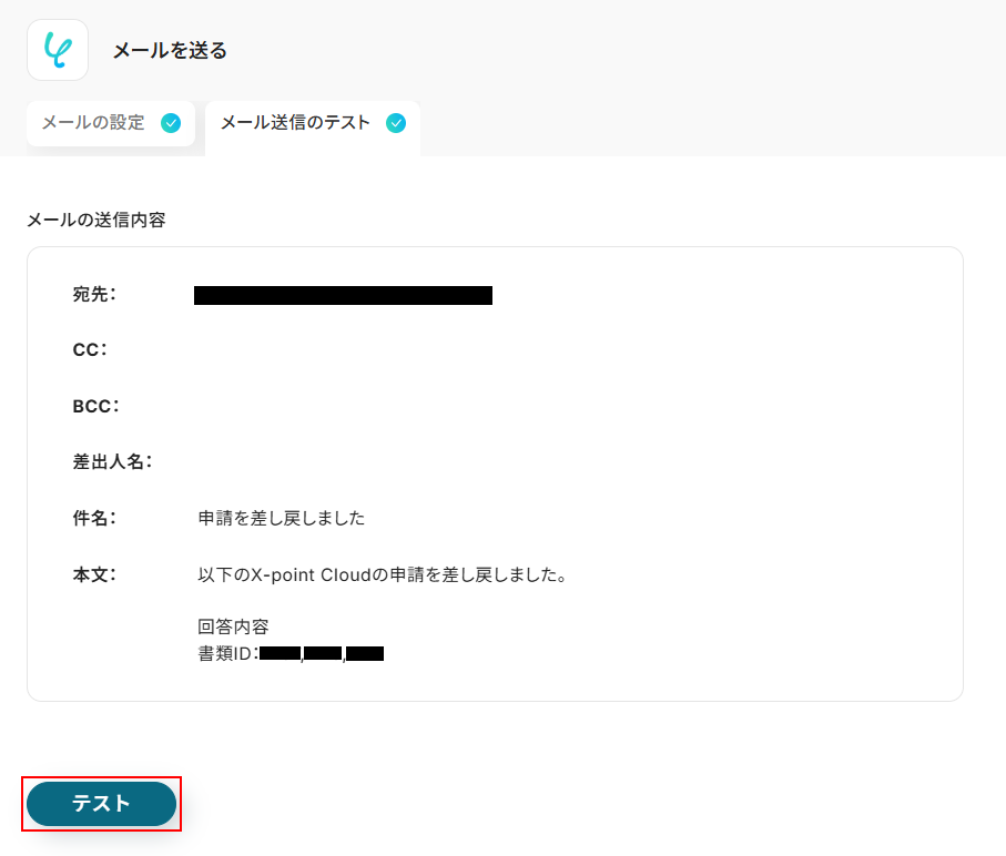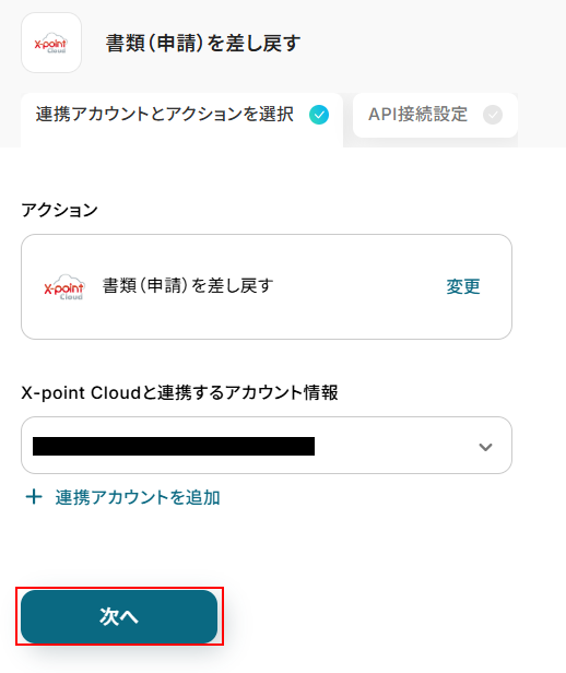 - 続いて、X-point Cloudの「書類(申請)の承認を取り戻す」アクションを設定し、前のステップで抽出した情報を指定します