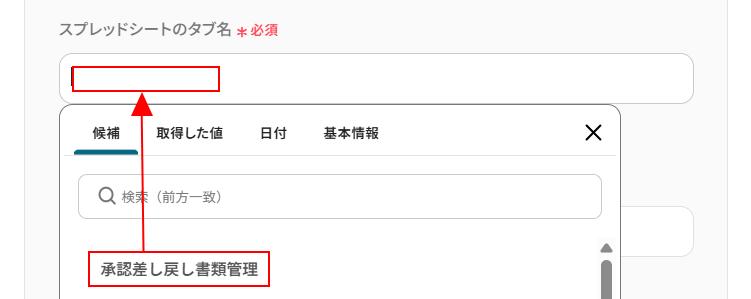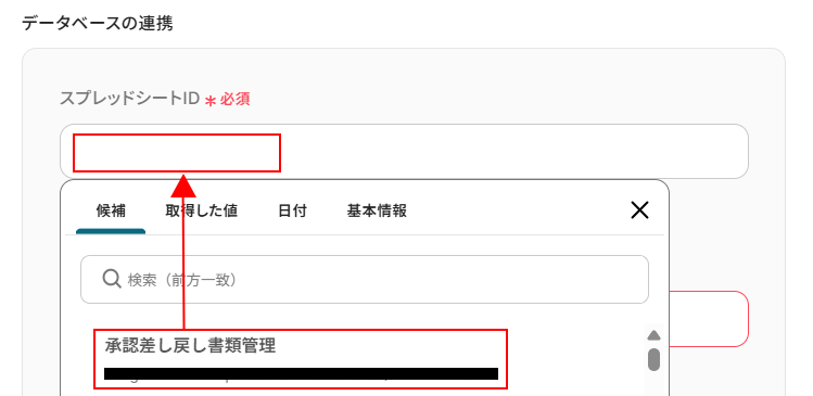 - Google スプレッドシートのオペレーションでは、差し戻しリストが記載された任意のスプレッドシートIDやシート名を設定してください