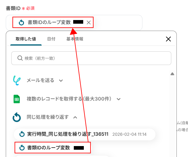 - ループ機能の設定では、Google スプレッドシートから取得した情報の中から、繰り返し処理の対象としたい値を指定します