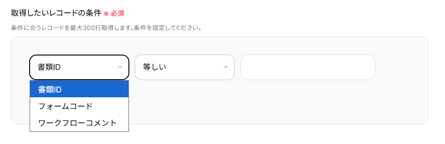 - 次に、オペレーションでGoogle スプレッドシートの「レコードを取得する」アクションを設定し、申請情報を管理しているシートを指定します。