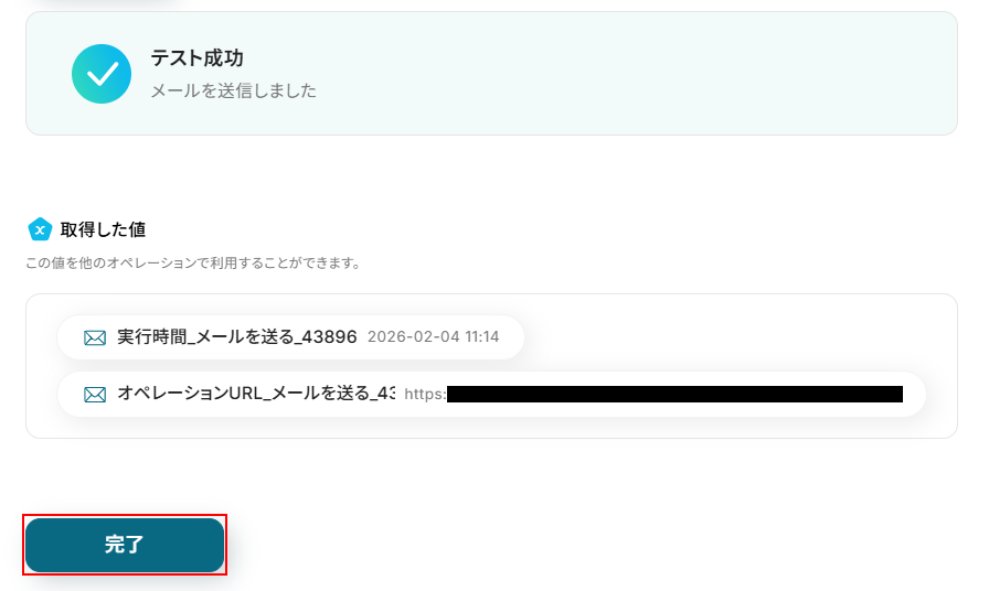 - 完了通知を送るメール機能では、宛先や件名、本文を自由にカスタマイズでき、本文には前のステップで取得した情報を変数として含めることも可能です