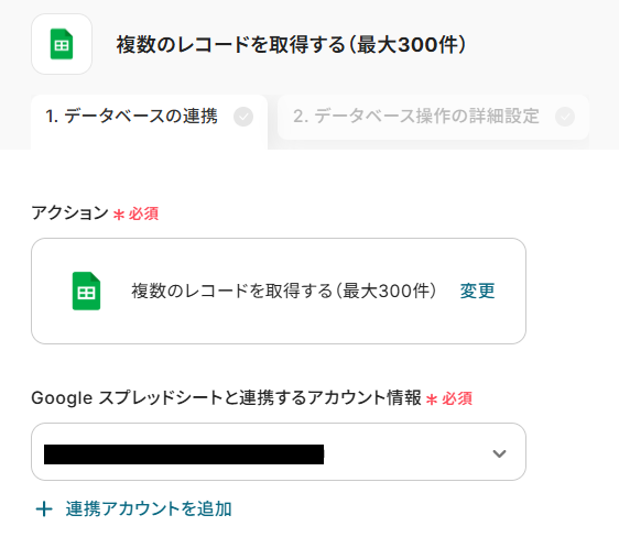 - 次に、オペレーションでGoogle スプレッドシートの「複数のレコードを取得する」アクションを設定し、差し戻し対象が記載されたシートの情報を取得します