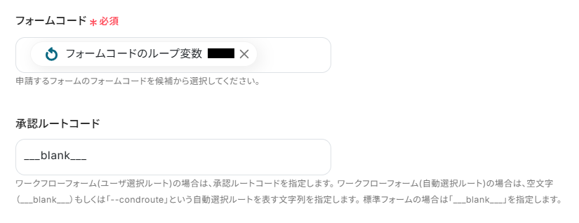- X-point Cloudのオペレーションでは、提出先のフォームコードや、申請内容を反映させるフィールド項目を任意で設定できます。