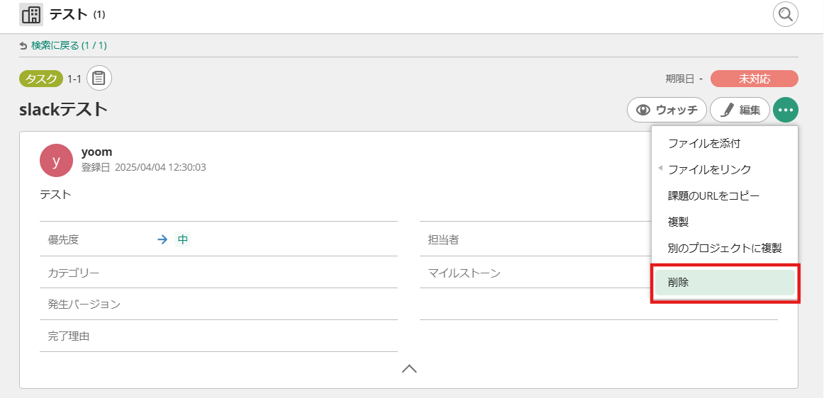 4. 設定後、Backlogで実際に”課題の削除”(今回のフローボットのトリガーとなるアクション)を実行し、Yoomの管理画面に戻って「テスト」をクリックしてください。