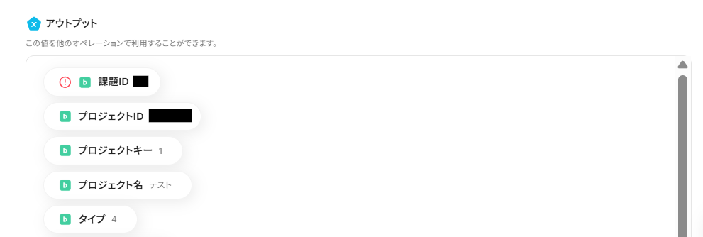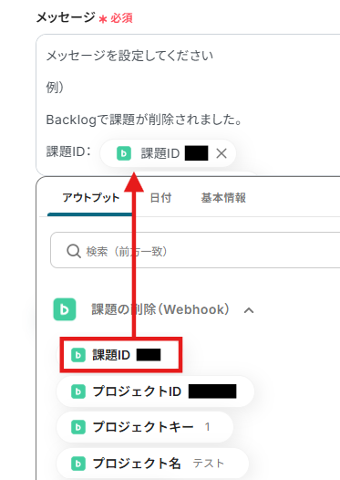 アウトプットを活用すると、Backlogから取得したデータを引用して自動通知することができます。「課題が削除されました。」など定型的な文章は、直接入力しましょう。
