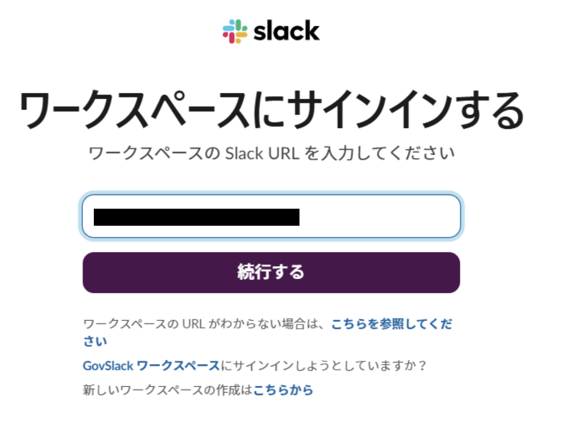 先ほどと同じように、Yoomの「新規接続一覧」の中からSlackを選択してサインインします。Yoomと連携するワークスペースURLを入力し、「続行する」をクリックしてください。