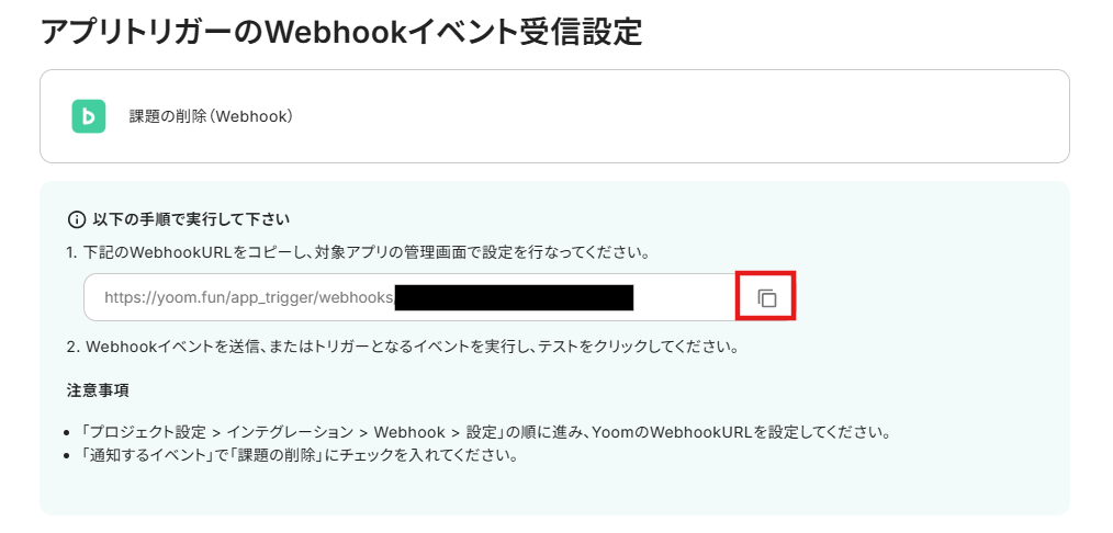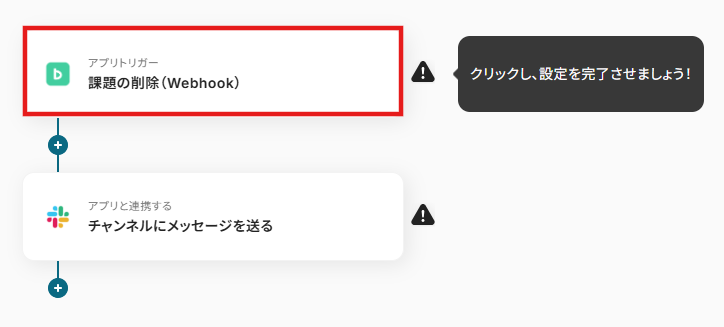 - 「トリガーアクション」→課題の削除(Webhook)を選択します