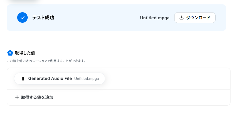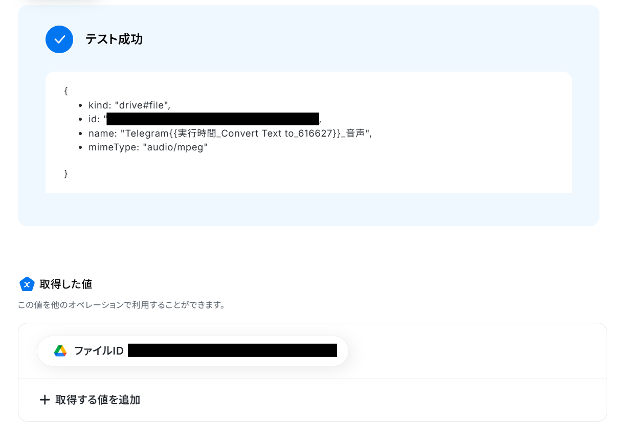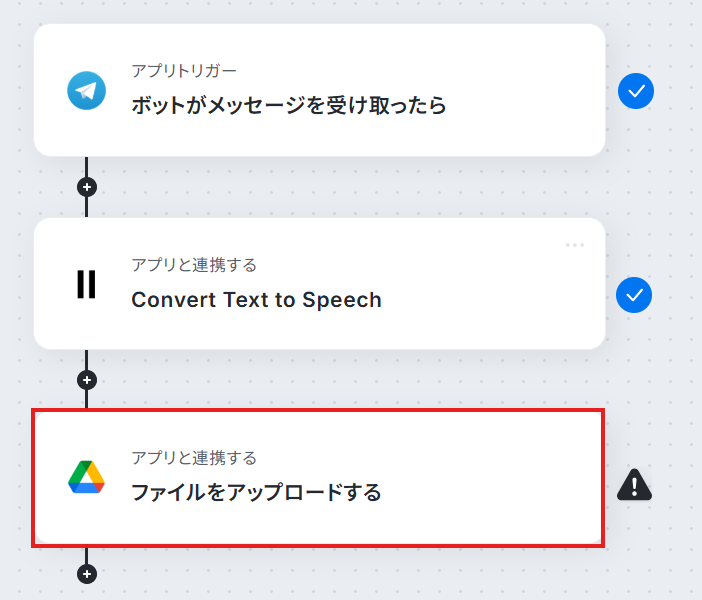 ElevenLabsの音声生成アクションでは、使用する声の種類(Voice ID)や、音声に変換するテキスト内容を任意で設定してください Google Driveへのファイルアップロード設定では、音声ファイルを格納するフォルダのIDや、保存する際のファイル名などを任意で指定することが可能です ■注意事項