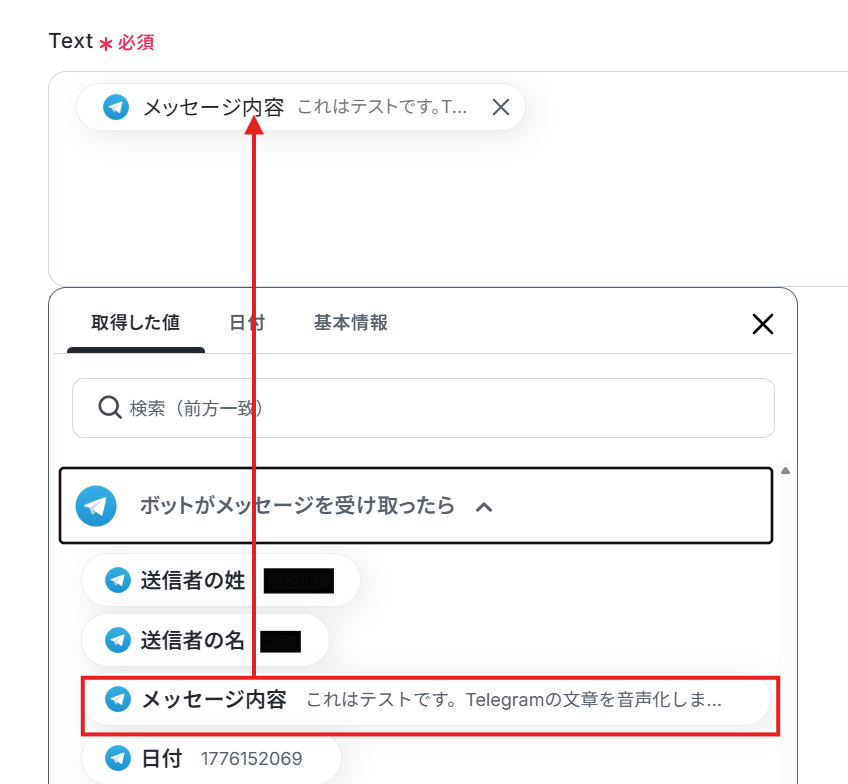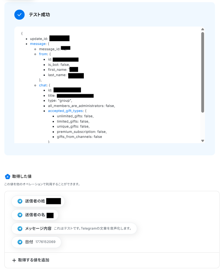 Telegramの「ボットがメッセージを受け取ったら」で取得したメッセージ本文、送信者情報、日時などの値を、後続のBox「フォルダを作成する」オペレーションで変数として埋め込むことが可能です。 ■注意事項