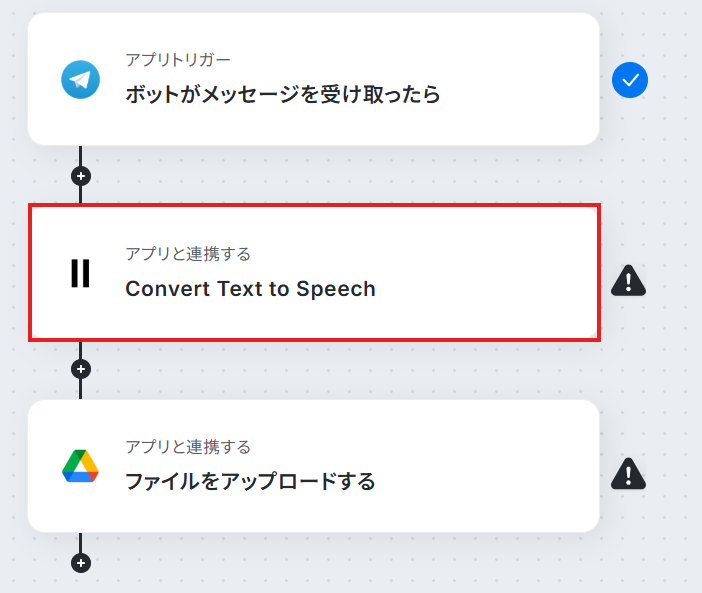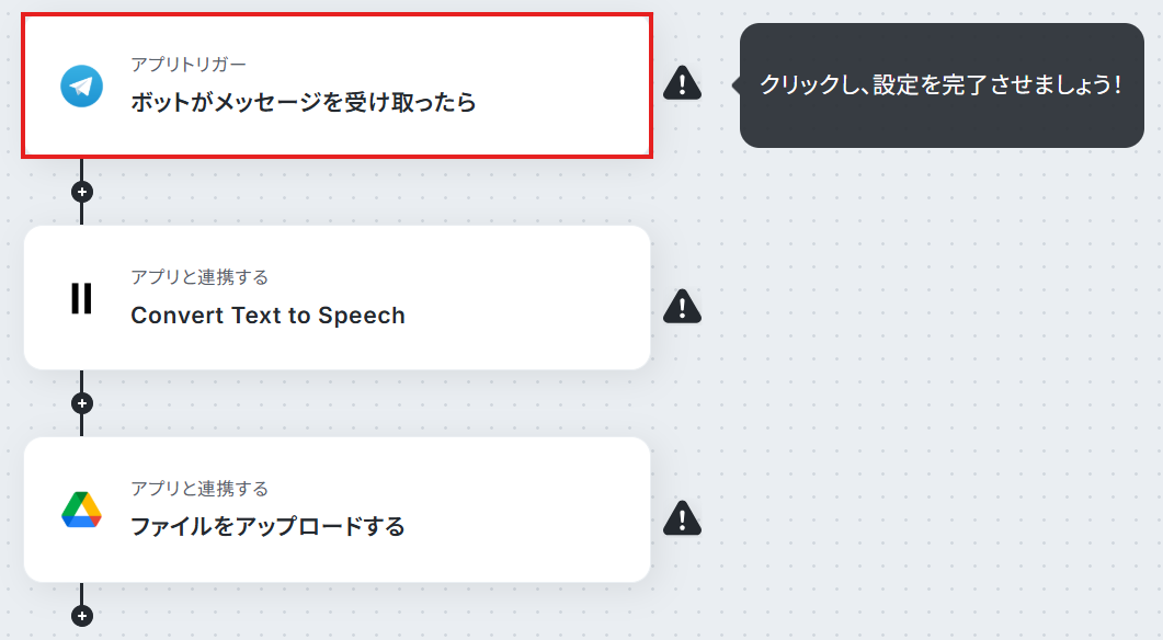 はじめに、Telegram、ElevenLabs、Google DriveをYoomと連携します 次に、トリガーでTelegramを選択し、「ボットがメッセージを受け取ったら」というアクションを設定します 次に、オペレーションでElevenLabsの「Convert Text to Speech」アクションを設定し、受信したメッセージテキストを音声に変換します 最後に、オペレーションでGoogle Driveの「ファイルをアップロードする」アクションを設定し、生成された音声ファイルを指定の場所にアップロードします ※「トリガー」:フロー起動のきっかけとなるアクション、「オペレーション」:トリガー起動後、フロー内で処理を行うアクション ■このワークフローのカスタムポイント