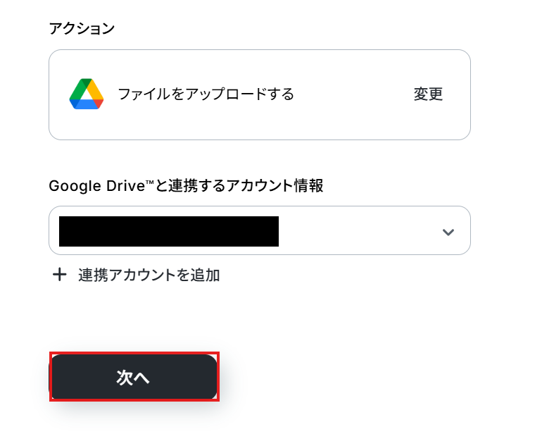 ステップ5:Google Driveへファイルをアップロードする設定 次にGoogle Driveへファイルをアップロードするアクションを設定していきます。