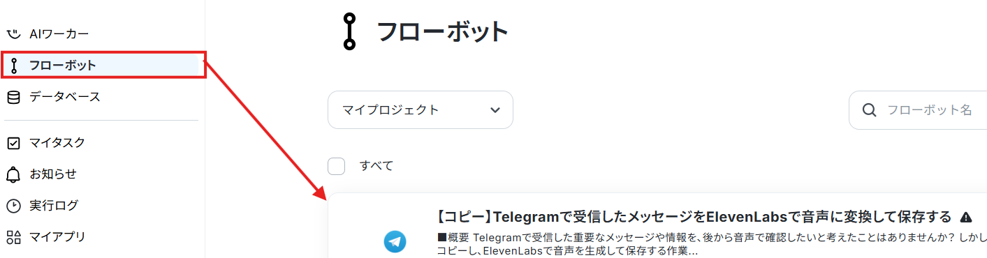 また、コピーしたテンプレートはフローボットに保存されているので、ここからも開くことができます。