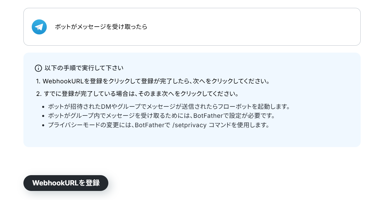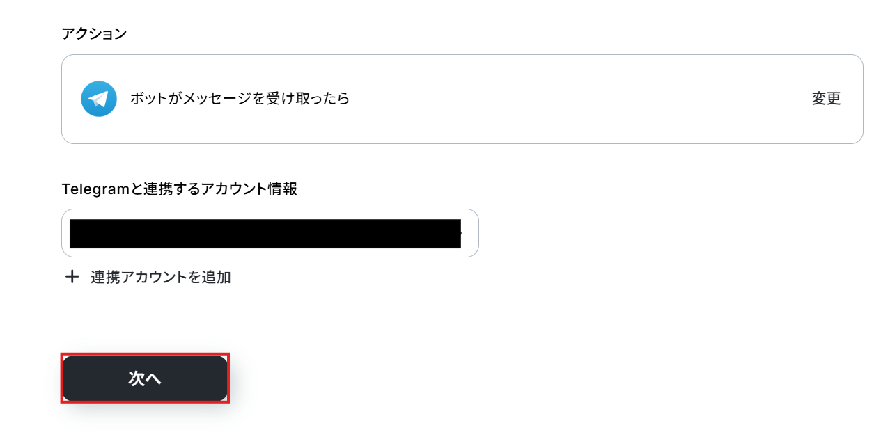 ステップ3:Telegramのトリガー設定 まずはTelegramのトリガーアクションを設定していきます。
