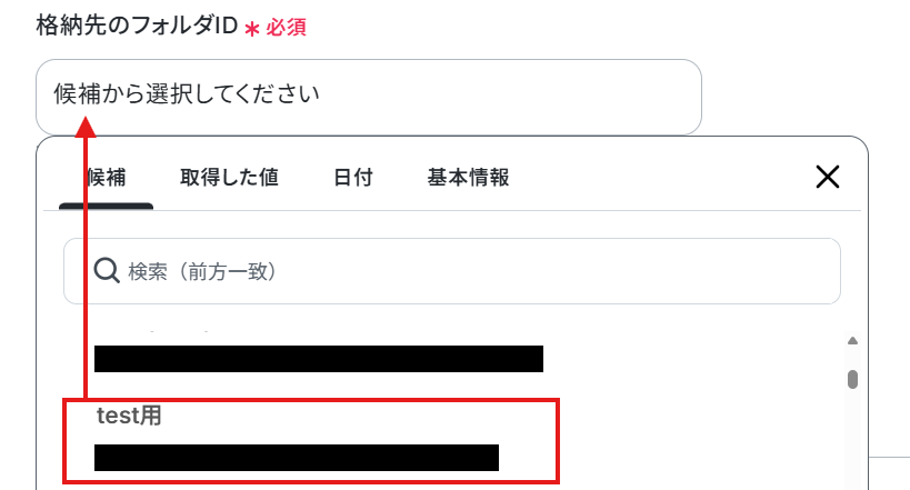 格納先のフォルダIDはボックスの候補から選択してください。