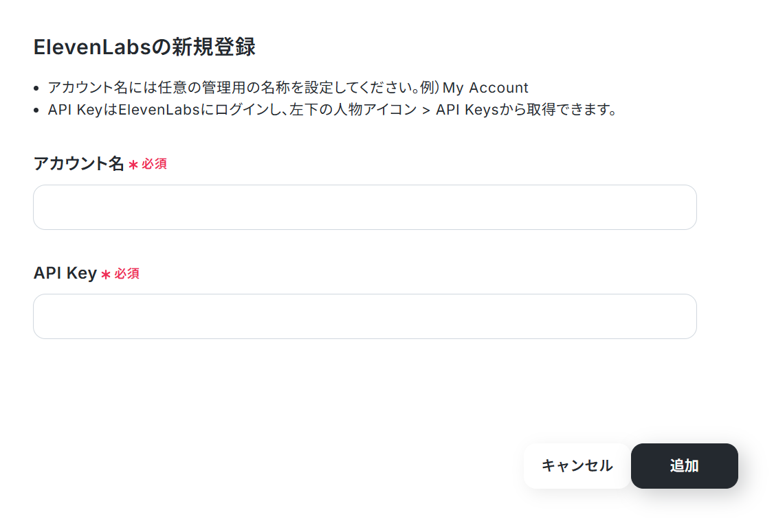 【ElevenLabsのマイアプリ連携】 脚注を参考に連携したいアカウント名、API Keyを入力して追加してください。