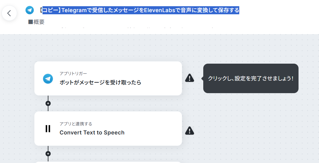 TelegramとElevenLabs、Google Driveをマイアプリ連携 該当のテンプレートをコピー Telegramのトリガー設定およびElevenLabsのアクション設定 トリガーをONにし、フローが起動するかを確認