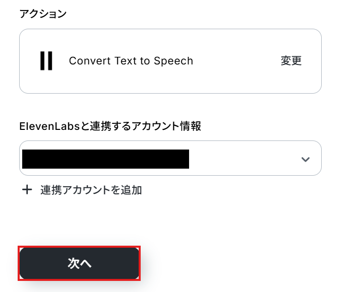 ステップ4:ElevenLabsで音声に変換する設定 次にElevenLabsでTelegramのメッセージを音声に変換するアクションを設定していきます。