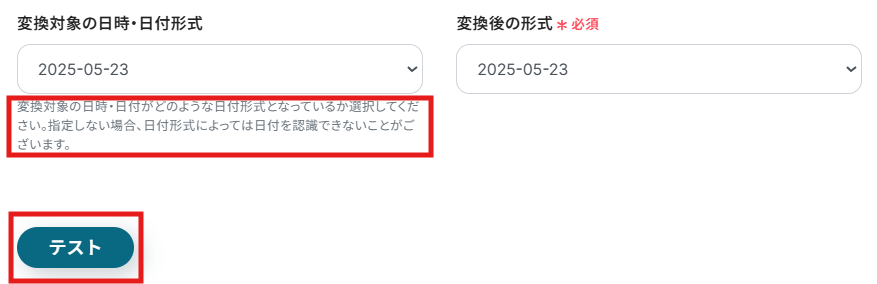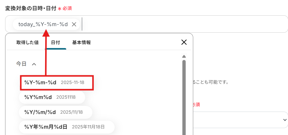 次に、変換対象の日付形式と変換後の形式を指定します。