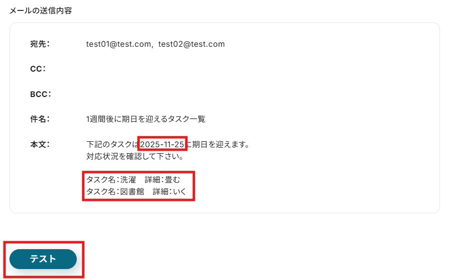 テストが成功して、今日を起点に7日後に期日を迎えるタスクのレコードが取得できました!