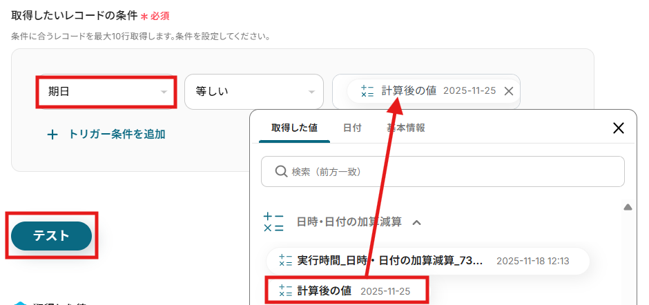 レコードの条件を指定したら、「テスト」をクリックしてください。