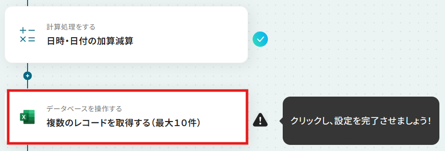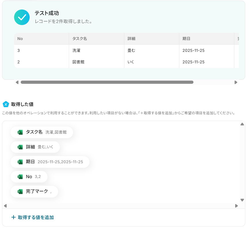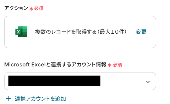 次に、Microsoft Excelののタスク管理表からレコードを取得する設定を行います。