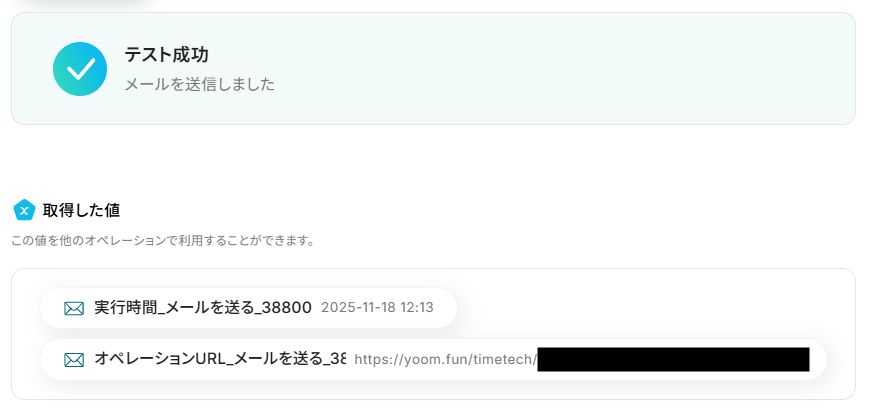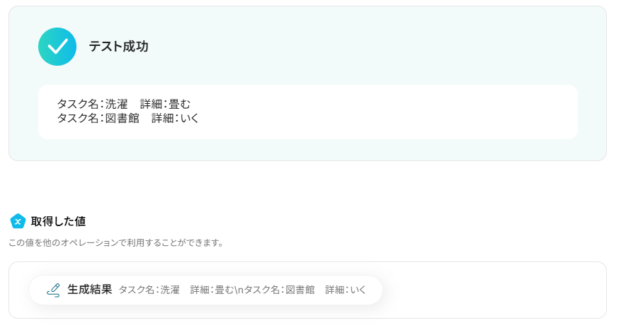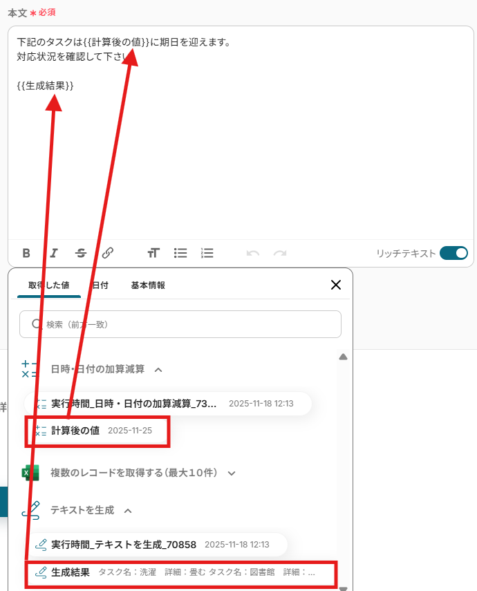 テキストを直接入力した部分は固定値として処理されるため、毎回変動が必要な情報({{計算後の値}}や{{生成結果}})には取得した値を活用することが重要です!