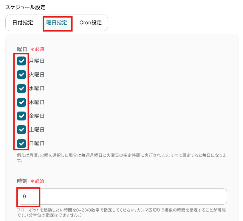 今回は、毎日朝9時にフローボットを起動する設定を例にしています。