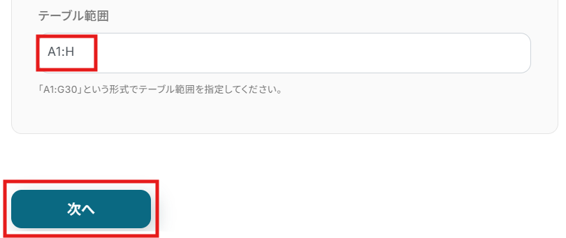 取得したいレコードが記載されているテーブル範囲を任意で入力し、「次へ」をクリックします。