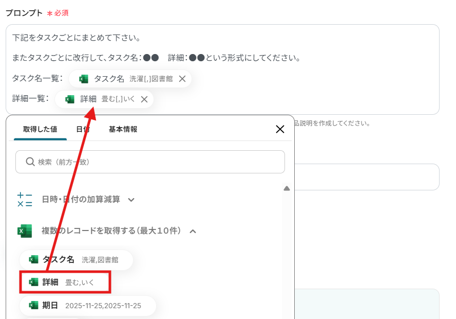 編集欄をクリックして、「複数のレコードを取得する(最大10件)」から、Microsoft Excelの情報を引用できます。
