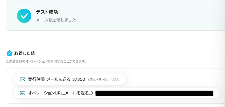 取得した値とは、トリガーやオペレーション設定時に、「テスト」を実行して取得した値のことを指します。取得した値は、後続のオペレーション設定時の値として利用でき、フローボットを起動する度に、変動した値となります。詳しくは以下をご覧ください。