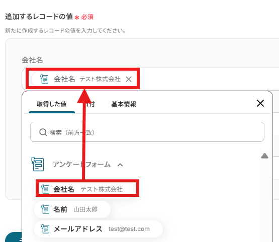 追加するレコードの値を、それぞれ取得した値から入力していきます。