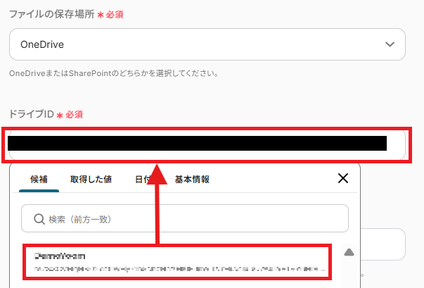 ドライブIDは候補から入力してください。