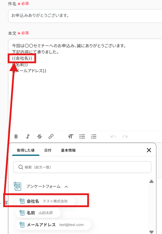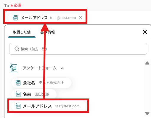 今回は顧客に送信するメールですので、取得した値よりアンケートフォームに入力いただいたメールアドレスを選択します。