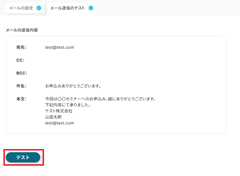 全て入力し終わったら「テスト」ボタンを押してください。