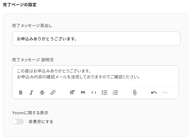 - 完了メッセージ見出し:お申込みありがとうございます。