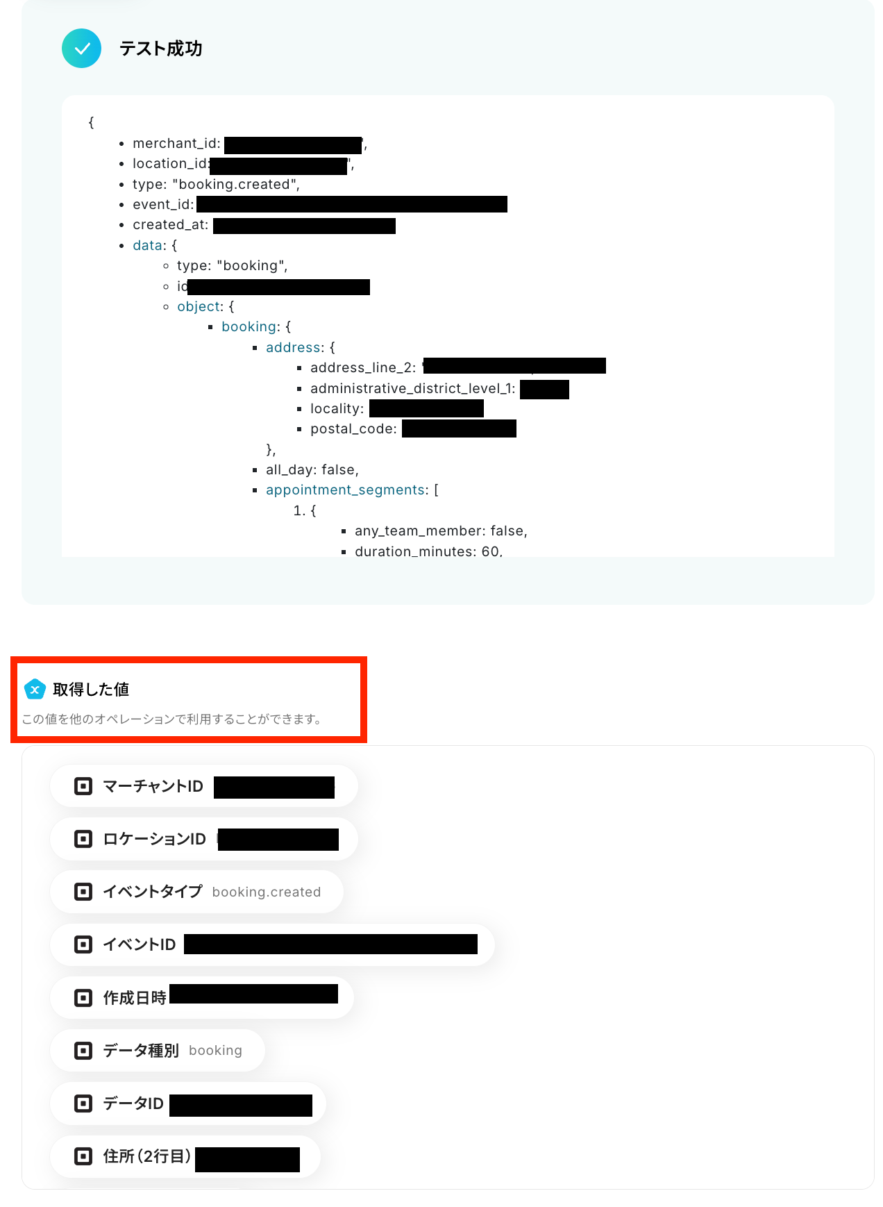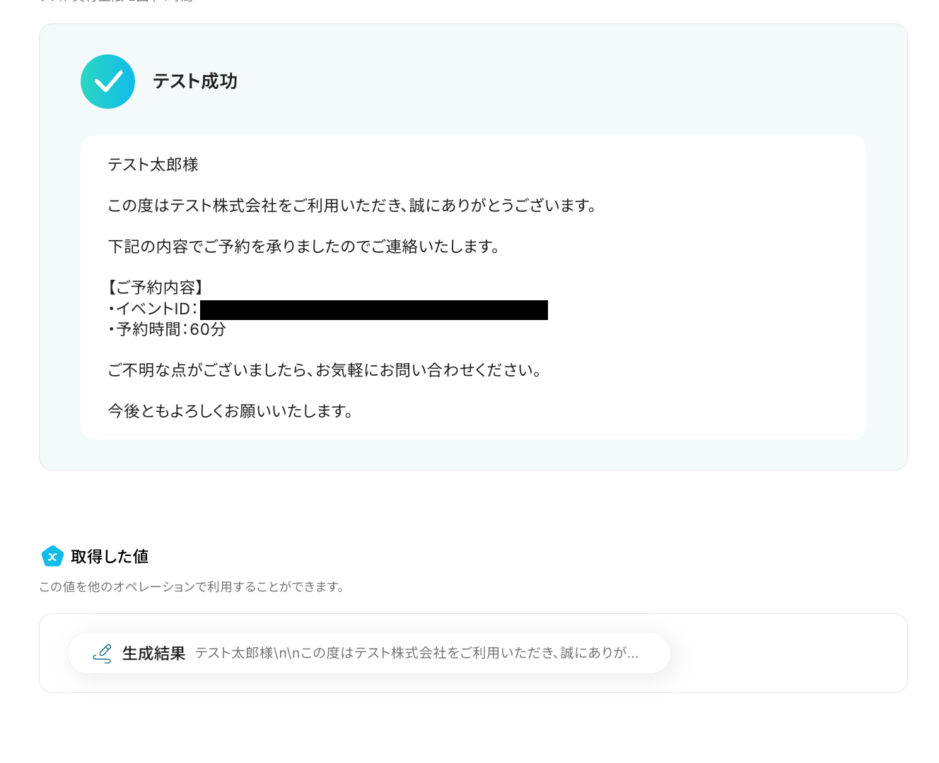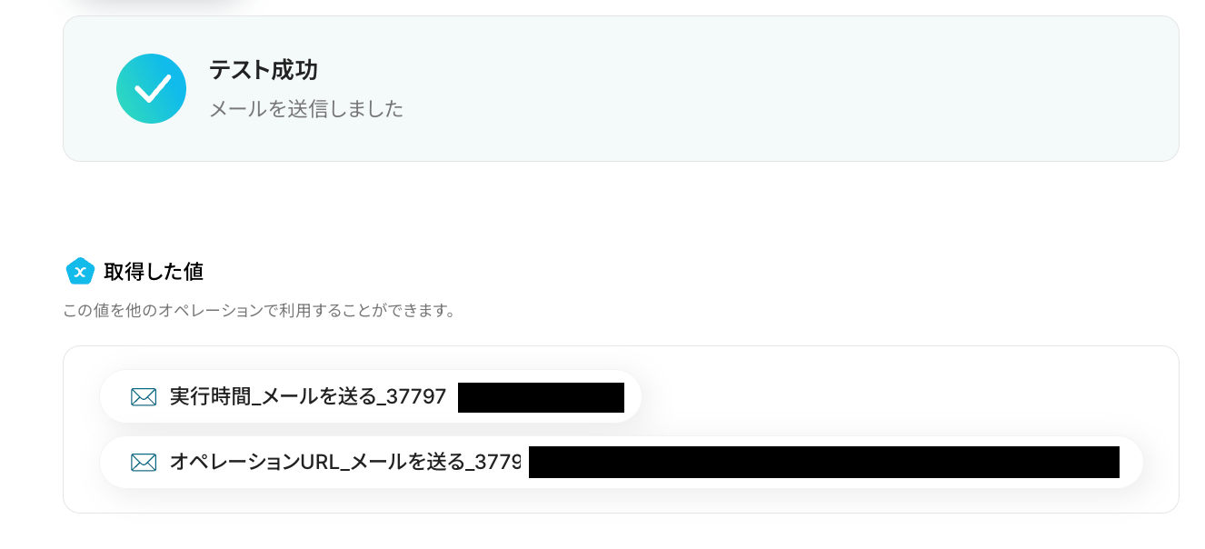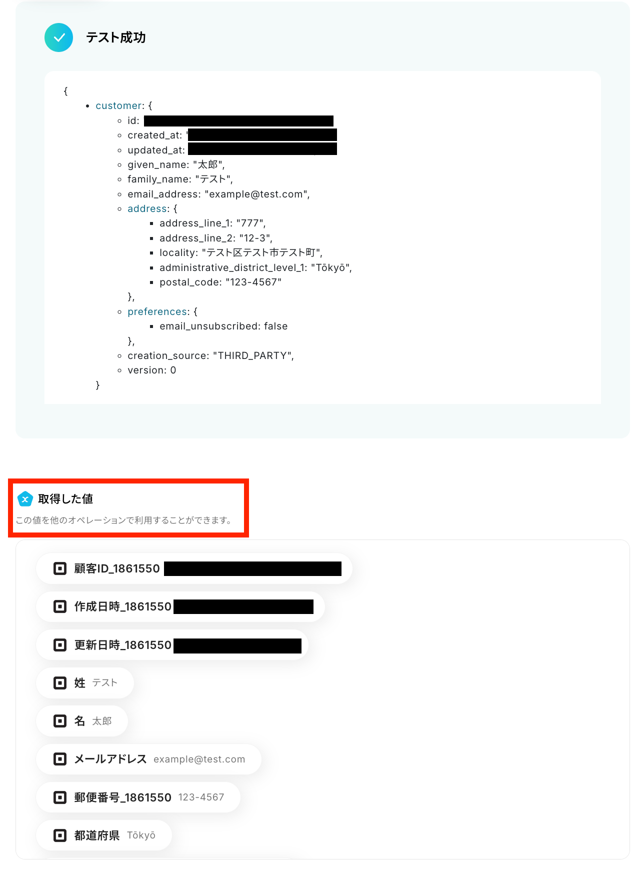 「テスト成功」と表示が出たら、取得した値が取得されます。