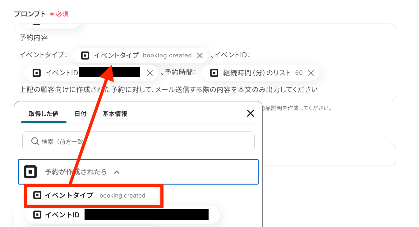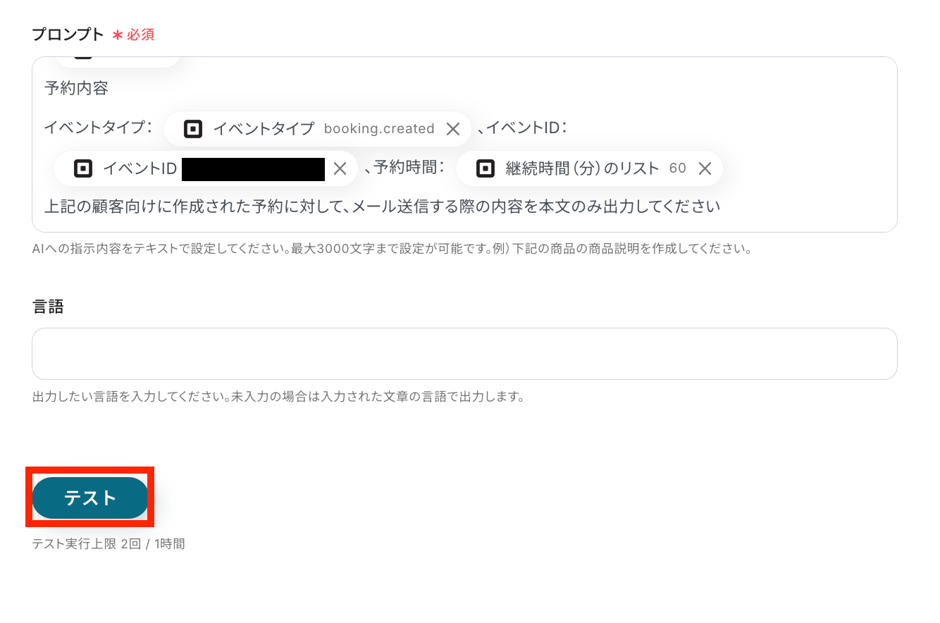 プロンプトを取得した値を活用しながら設定して、AIに希望のテキストを作成してもらえるように指示を出します。