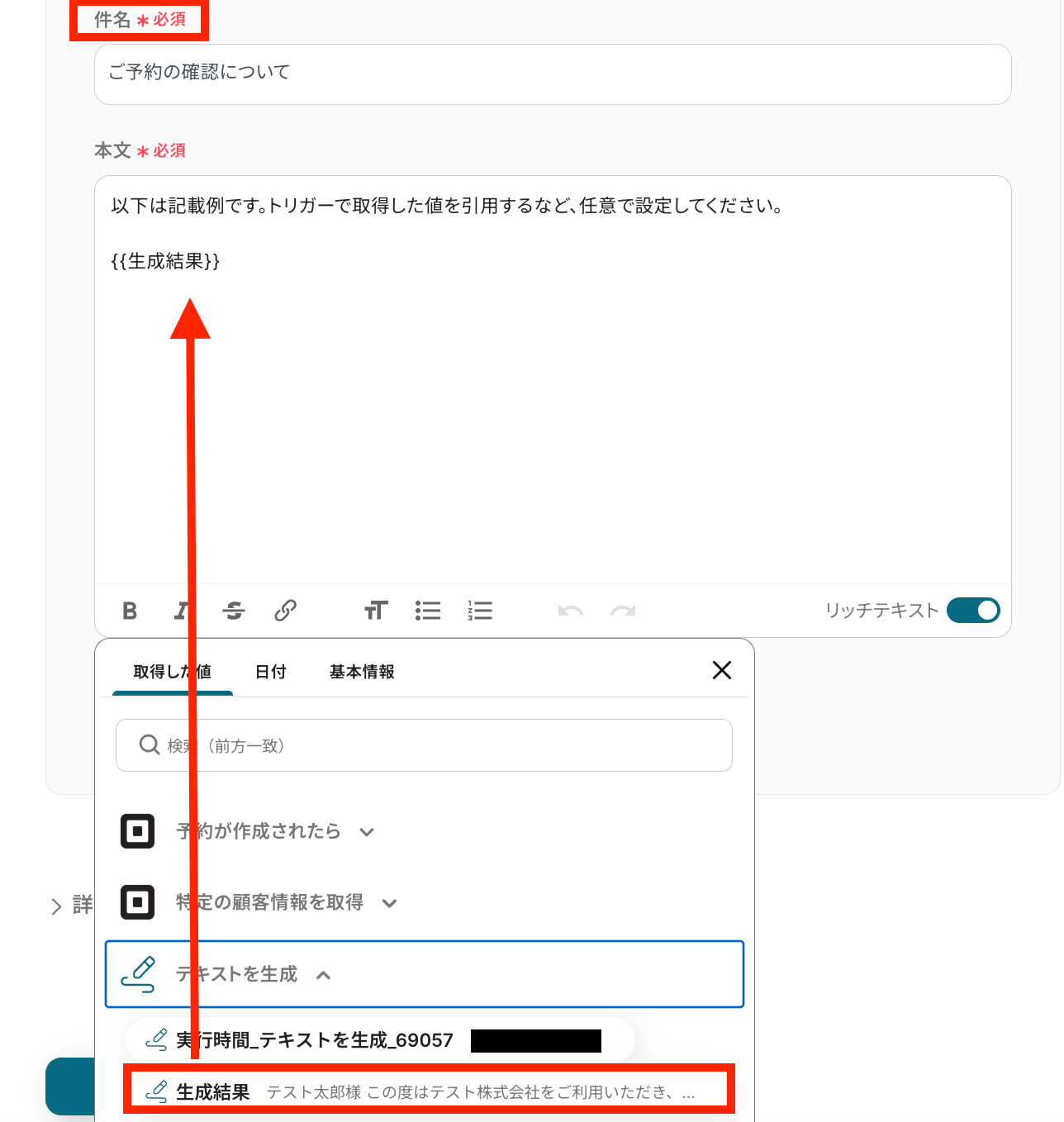 件名を手動で設定したら、生成したテキストを利用して、メール本文を作成します。