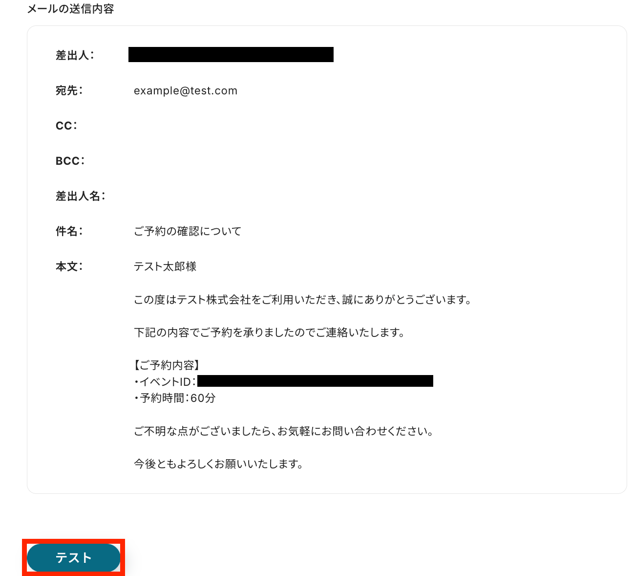メール内容に問題がないか確認が終わったら、最後に「テスト」ボタンをクリックしましょう。