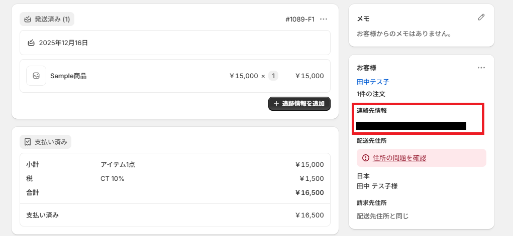 Webhook設定が完了したら、次はトリガーとなるイベント【注文の発送】を行います。 作成する内容は、架空の情報(「テスト商品」など)でOKですが、のちにメール送信テストを行うので、連絡先情報のみ実際にメールを受信できるアドレスを入力してください。
